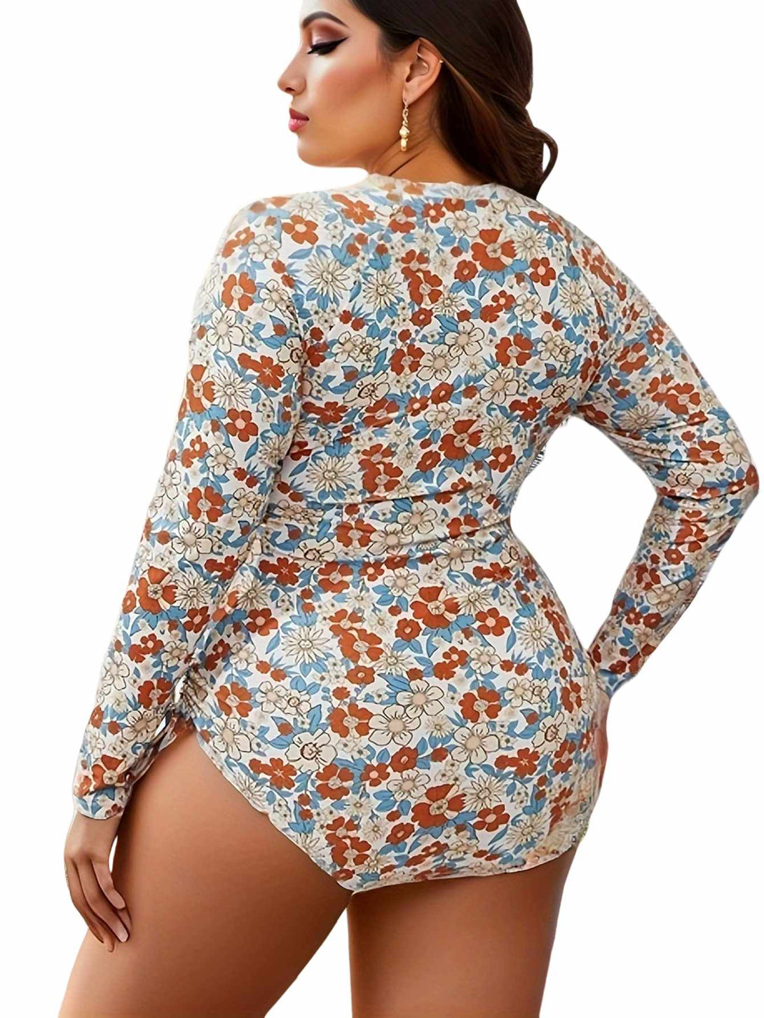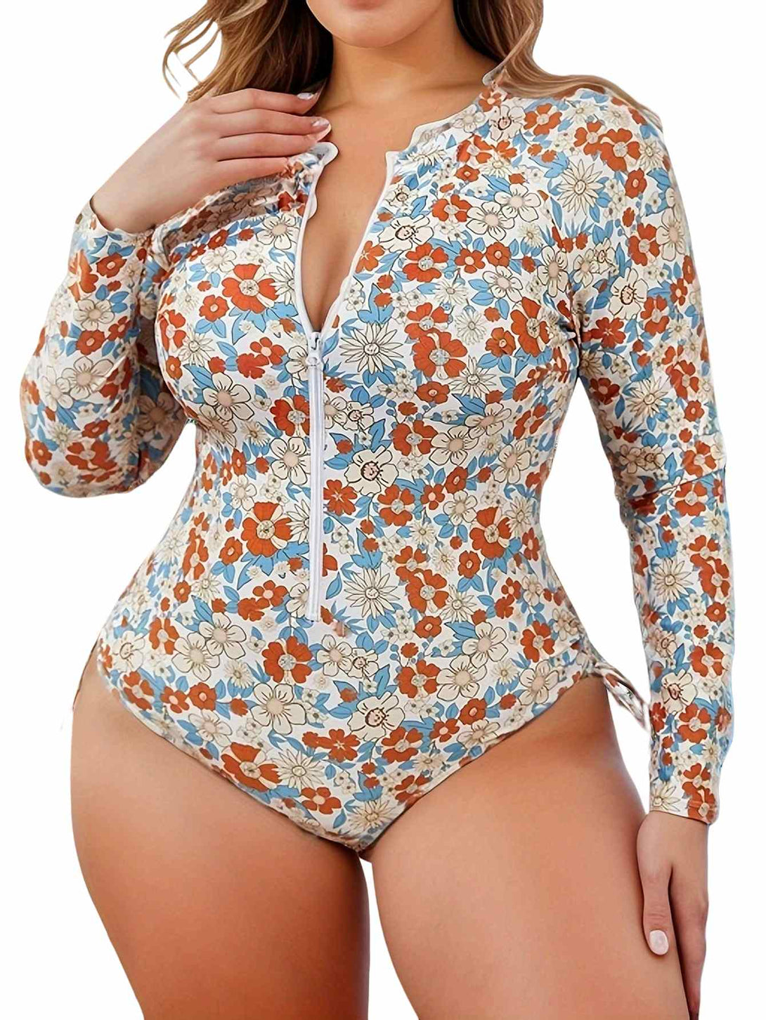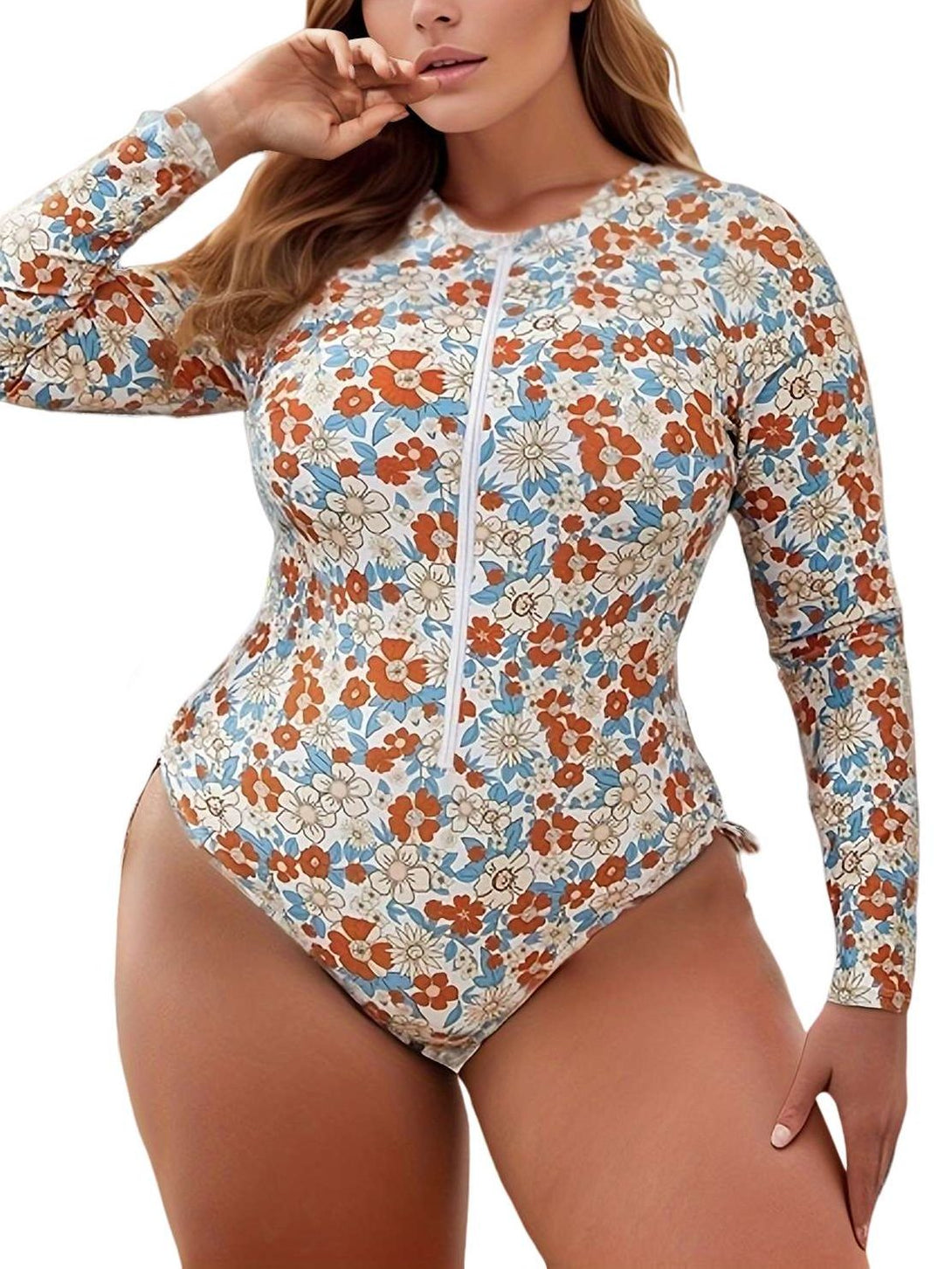 Plus Size Floral Long Sleeve Zipper One-Piece Swimsuit – Sun Protection Rash Guard