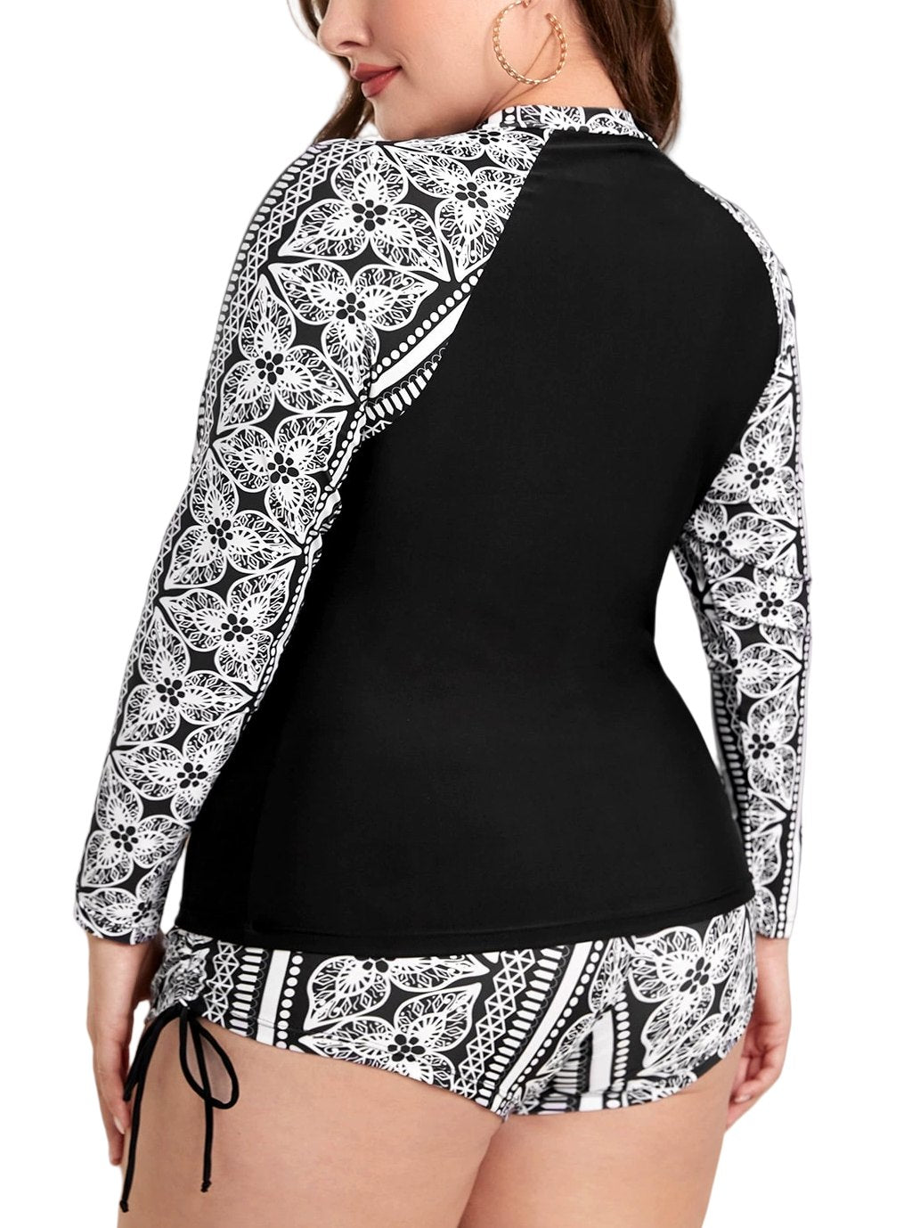 Plus Size Long Sleeve Rash Guard Swimsuit with Black & White Print Shorts – Zipper Top