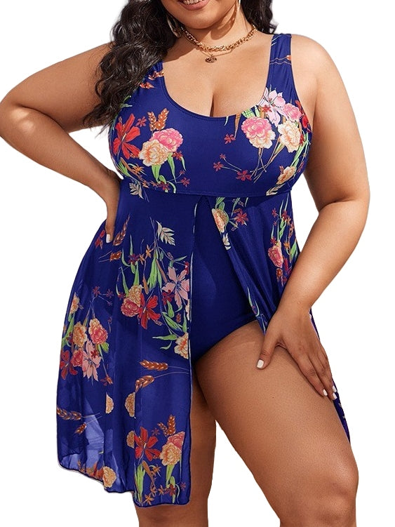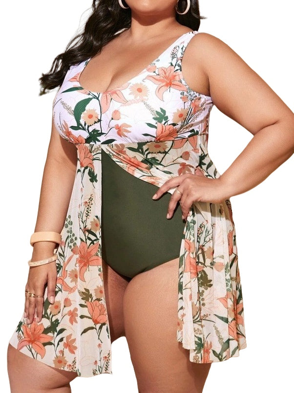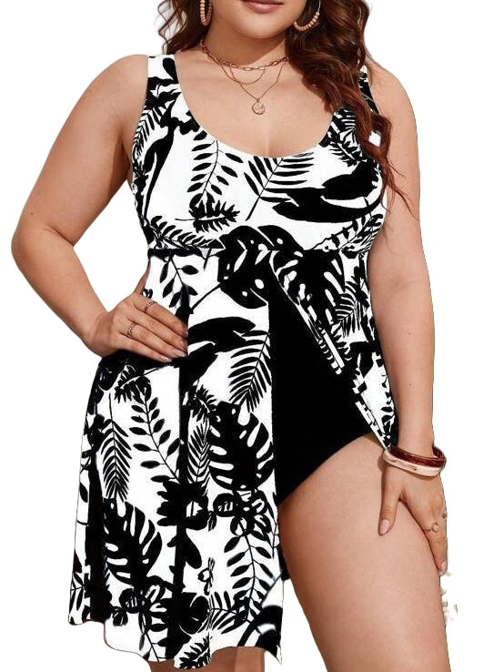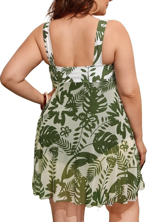 Bring tropical vibes to your beachwear collection with this flattering plus size swim dress. Designed with a supportive scoop neckline and a flowing mesh overlay, it combines the coverage of a dress with the comfort of a one-piece swimsuit. The tropical green leaf print adds a fresh, vacation-ready feel, while the built-in shorts keep you confident and worry-free in and out of the water. Perfect for swimming, sunbathing, or seaside strolls.