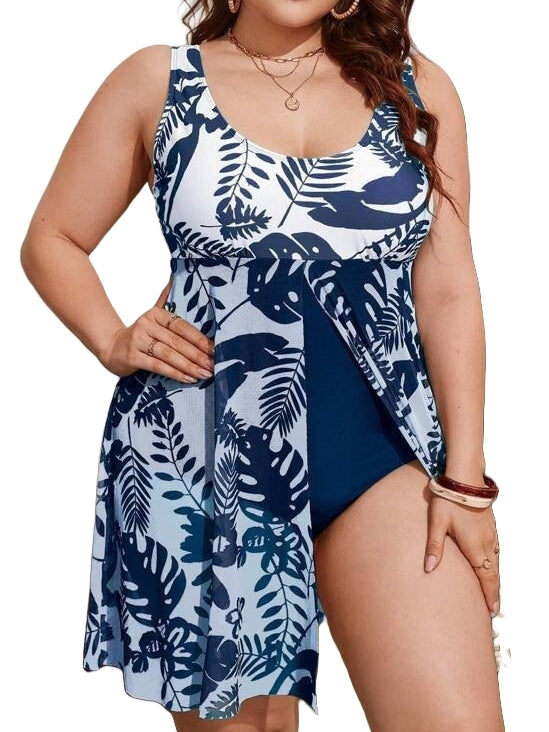 Plus Size One-Piece Swim Dress with Tropical Leaf Print and Mesh Overlay
