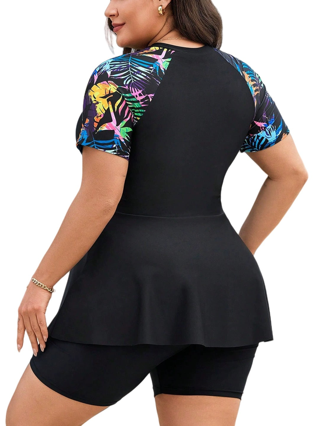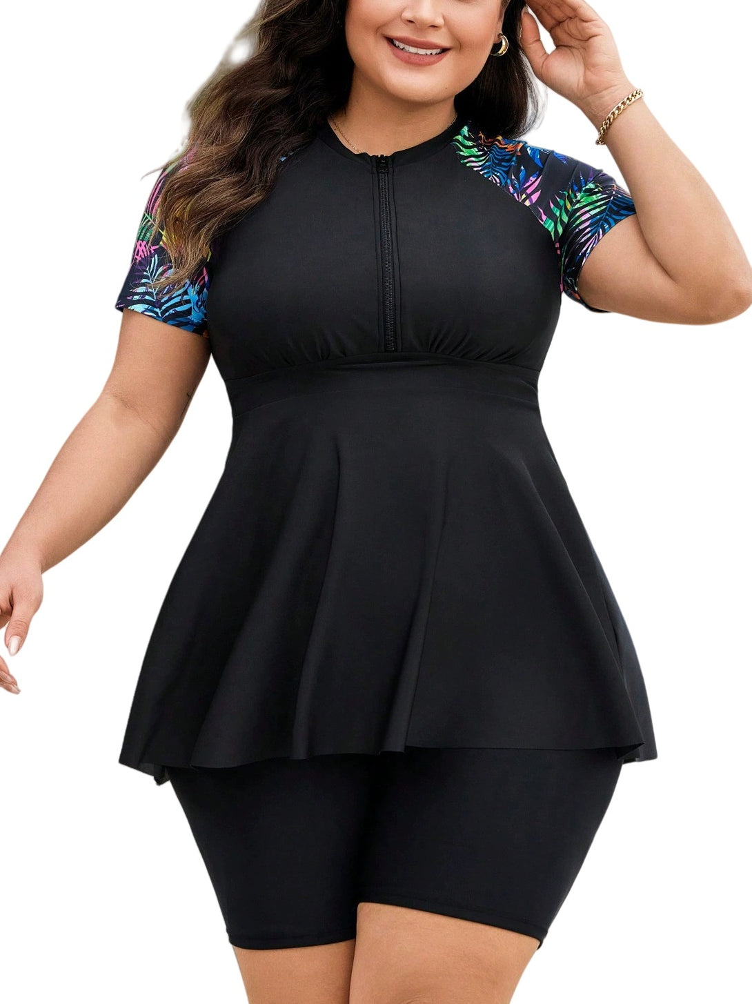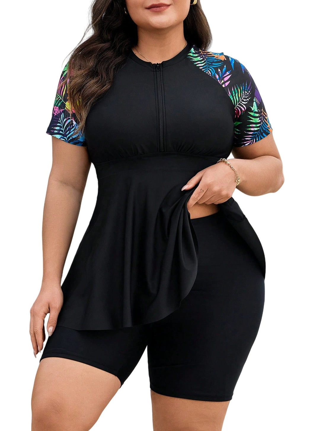 Stay active and stylish with this plus size short sleeve swim dress, designed with a front zipper and built-in shorts for full comfort and coverage. The colorful tropical print sleeves add a vibrant touch, while the flowy skirt design provides a flattering, modest look.